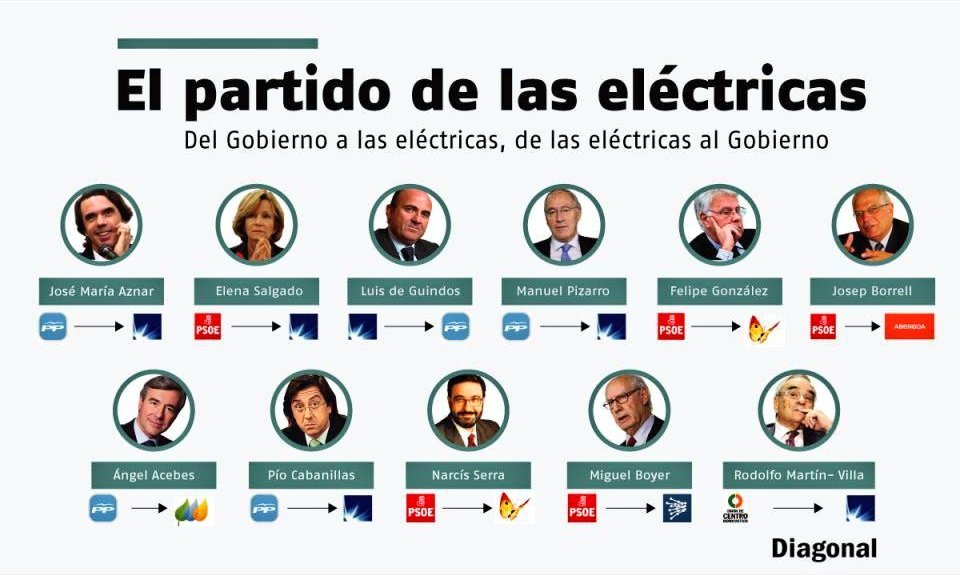 Determinados ex políticos, González , Aznar… de altas responsabilidades entran en los consejos de administración de las empresas energéticas, las cuales presionan a los gobierno para que no las perjudique. Eso sí, con argumentos muy de amor a la ecología, a la naturaleza y a la soberanía energética. El Gobierno tiene que hacer algo más. Garzón ponte las pilas.