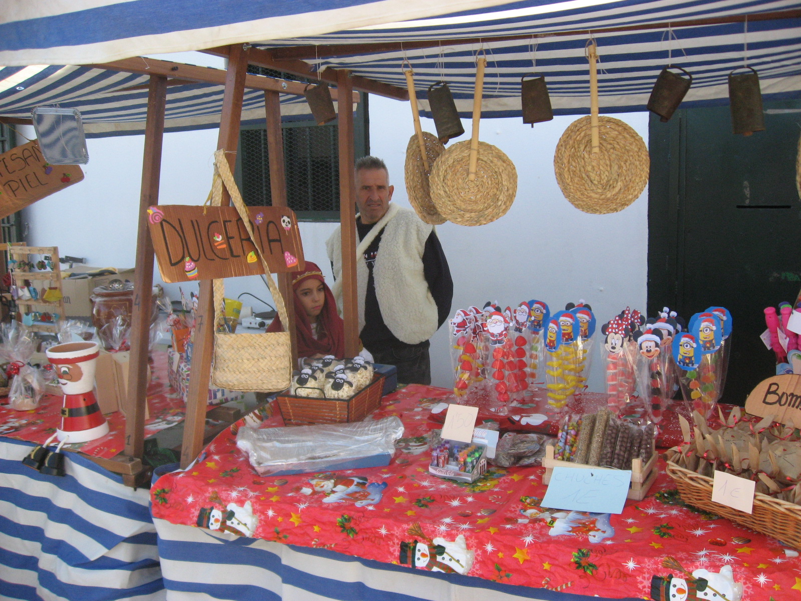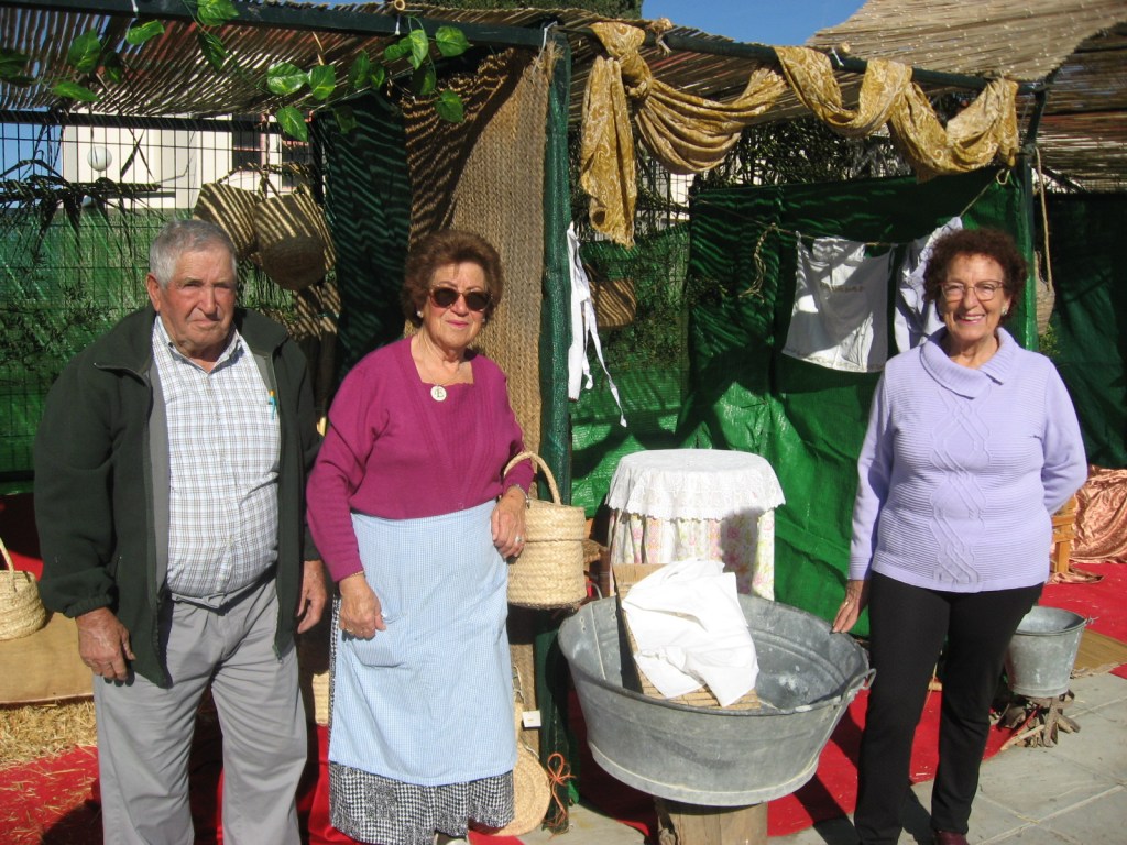 Muchos niños y niñas vestidos de pastor y con gorros, sombreros y trajes. Una burrito, ovejas, gallinas. La miel «Los Cortesanos» un años más estuve presente. La familia del joven, que padece una enfermedad «rara» tenía un puesto de pestiños, para recoger fondos para una nueva operación.