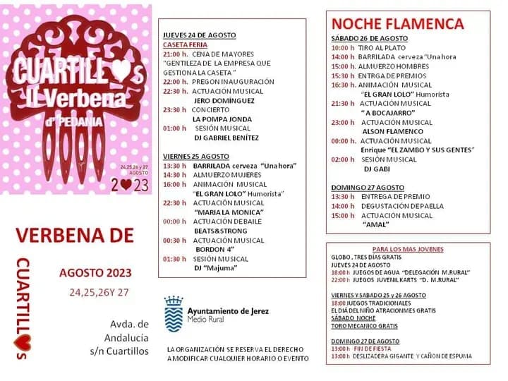 Hoy domingo 27.08.2023 ha finalizado la verbena de la pedanía de Cuartillo. Los asistentes llegaban un poco mas tarde, debido que la noche del sábado, a pesar del ventarrón visitante, fue de éxito para un éxito, «Alson flamenco», con un baile flamenco muy bien interpretado, y la actuación estelar de «El Zambo y sus gentes». Preguntado a diversos asistentes, confirmaron el éxito en los cantes de Luis «El Zambo», maestro, y los jóvenes que lo acompañaban.